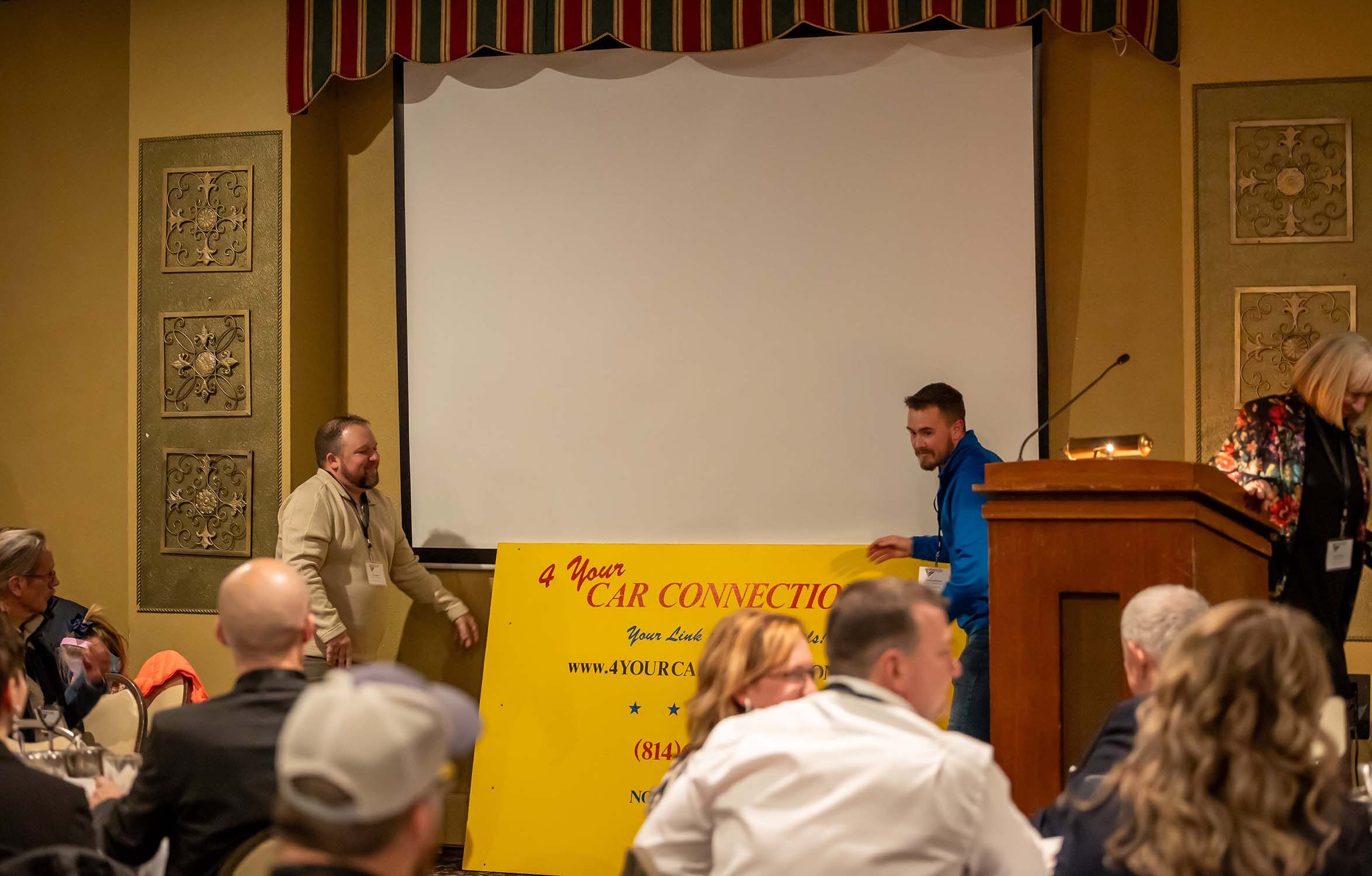I want to reference this yellow sign here. [A large handmade sign sat at the focus of the ballroom, just beside the podium.] This sign was our very first sign at the dealership. This sign was first at the Seneca location and then moved to our current location across from the Cranberry Mall. I remember getting in my old piece of crap 1991 Chevy truck, four by four, five-speed, long-bed. I drove it to the lumber yard. I bought this 4x6 green board. I bought some yellow paint, bought some rollers, and went home to the basement and painted the sign. I called a gentleman who lived in Oil City who did stencil work and I got the sign lettered up. This sign is very important to me. It is now hanging in one of my garages. Everytime I walk in I see it. It is really imperative for us to know how and where we started, and to never forget the people who stood with us, currently stand with us, and walk with us in our current endeavors. I will never forget. Thank you, God Bless.
