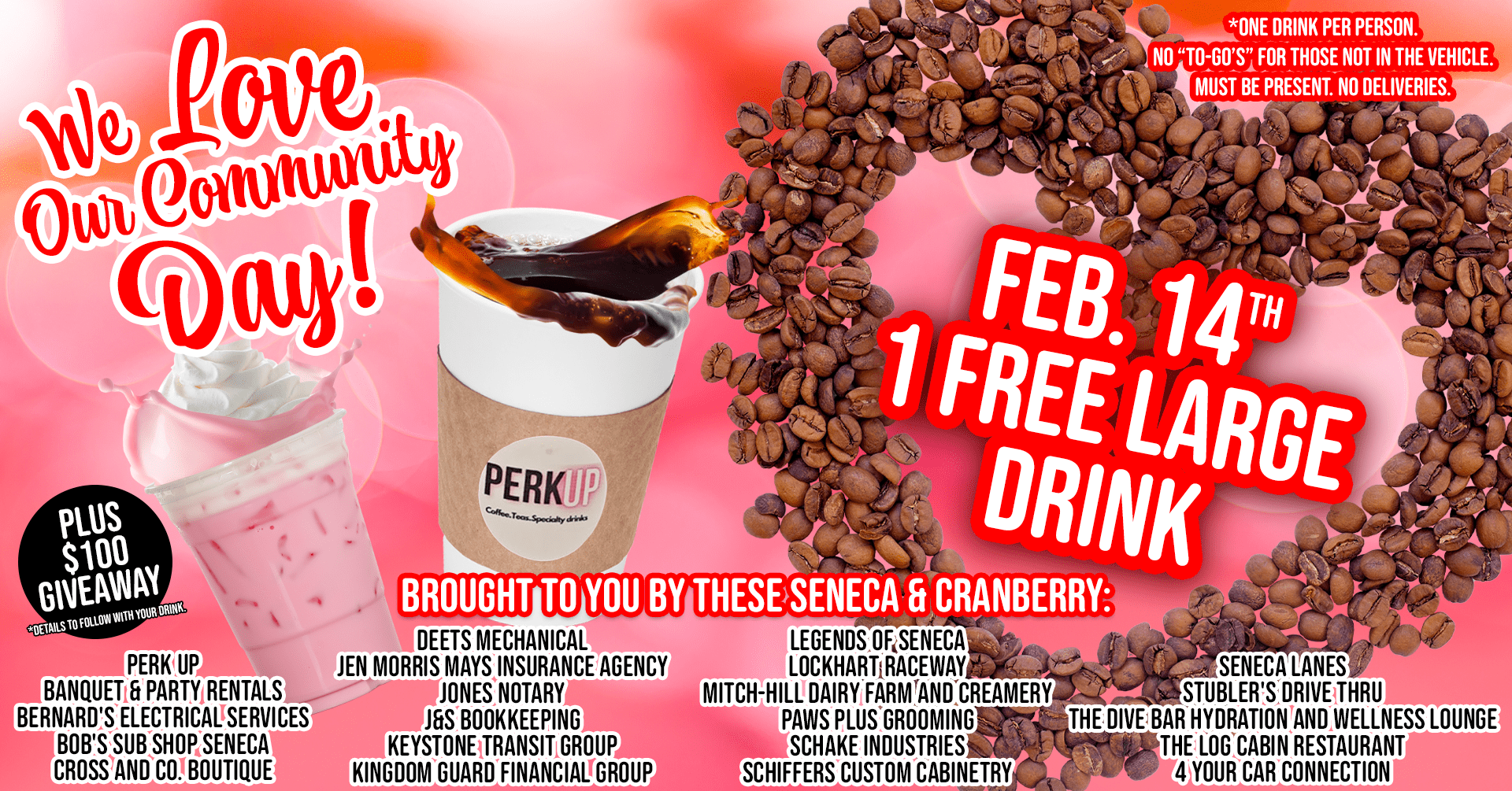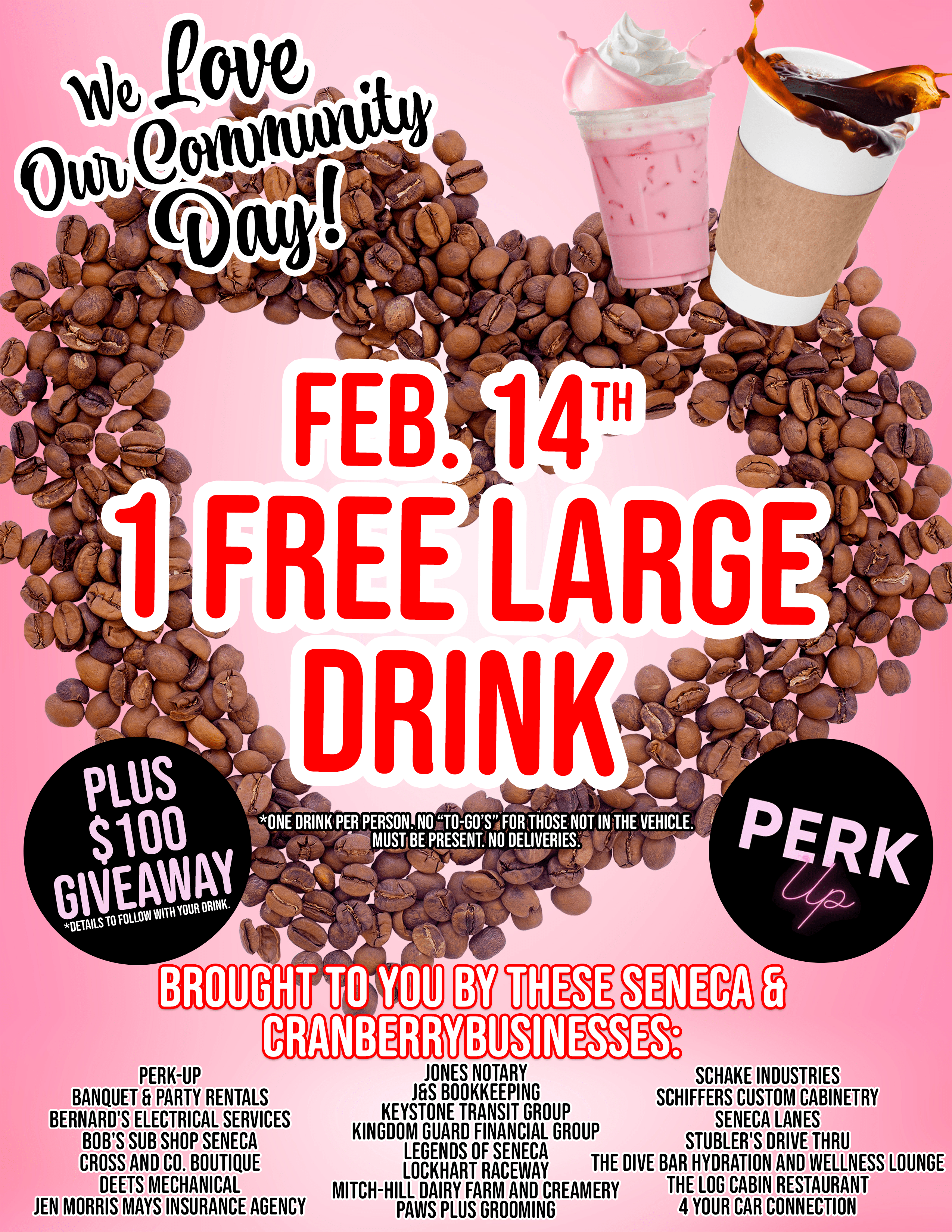 In the heart of Cranberry and Seneca, love is brewing, and we're thrilled to invite you to join us for a day of warmth, connection, and community spirit on "We Love Our Community Day" at Perk Up Coffee Shop. On Valentine's Day, February 14th, from 6:30 am to 3:00 pm, Perk Up and 20+ other amazing Cranberry and Seneca businesses have come together to spread love in the form of a FREE large drink just for you! Everyone who visits their drive-thru will receive a large free drink of their choice.