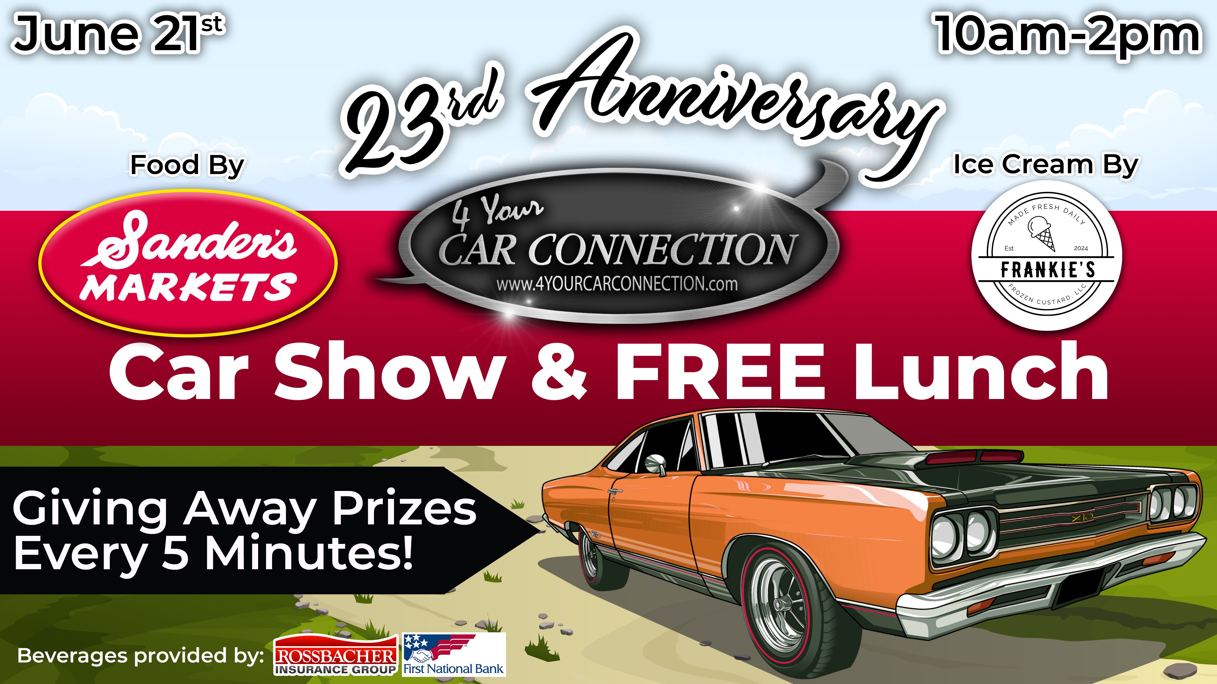 We’re celebrating 23 amazing years at 4 Your Car Connection, and you’re invited to the party! Bring the whole family out for an afternoon of fun, food, music, and nonstop prizes. Whether you’re here for the classic cars, the giveaways, or just a good time with great people — you won’t want to miss this!